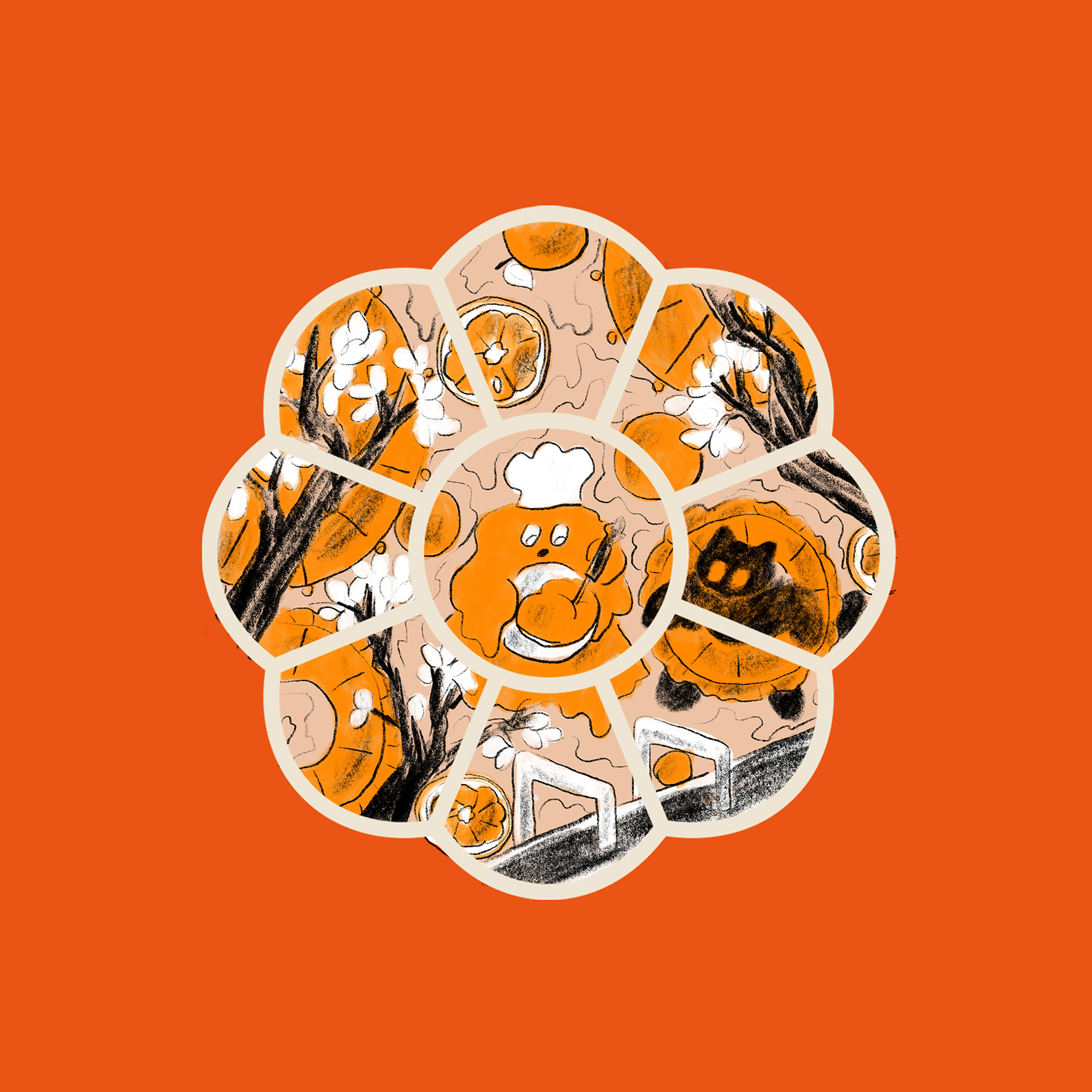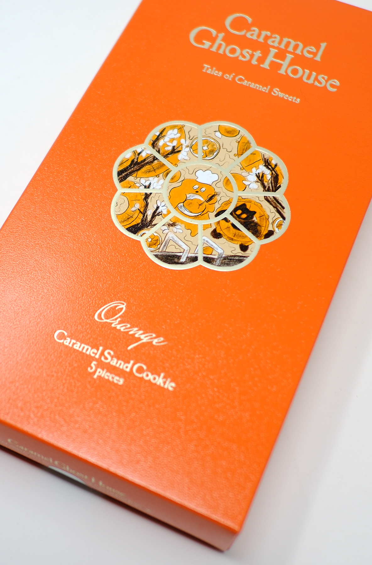 キャラメルゴーストハウス夏の限定商品、キャラメルサンドクッキー オレンジが発売、イラストを担当しました。ADは河西達也さん。オレンジ型の窓枠の中に、プール遊びを楽しむメルちゃん、プールでもお仕事のキャラメルおばけ、プールに浮かぶオレンジを描きました。全体的にまんまるばかりの構成に。