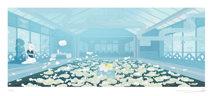50枚限りの完全限定で、表にサインとナンバリングが入っています。美術館などでも使われている非常に美しいジクレー印刷の技術を使い、版画用で厚みのあるHahnemuhle German Etching 310gsm paperに印刷してあります。すべてのプリントには、コーティングがしてあり、アシテート紙をかぶせた上で筒に入れて出荷します。額装が必要な方は、額に入れたバージョンもご用意しています。